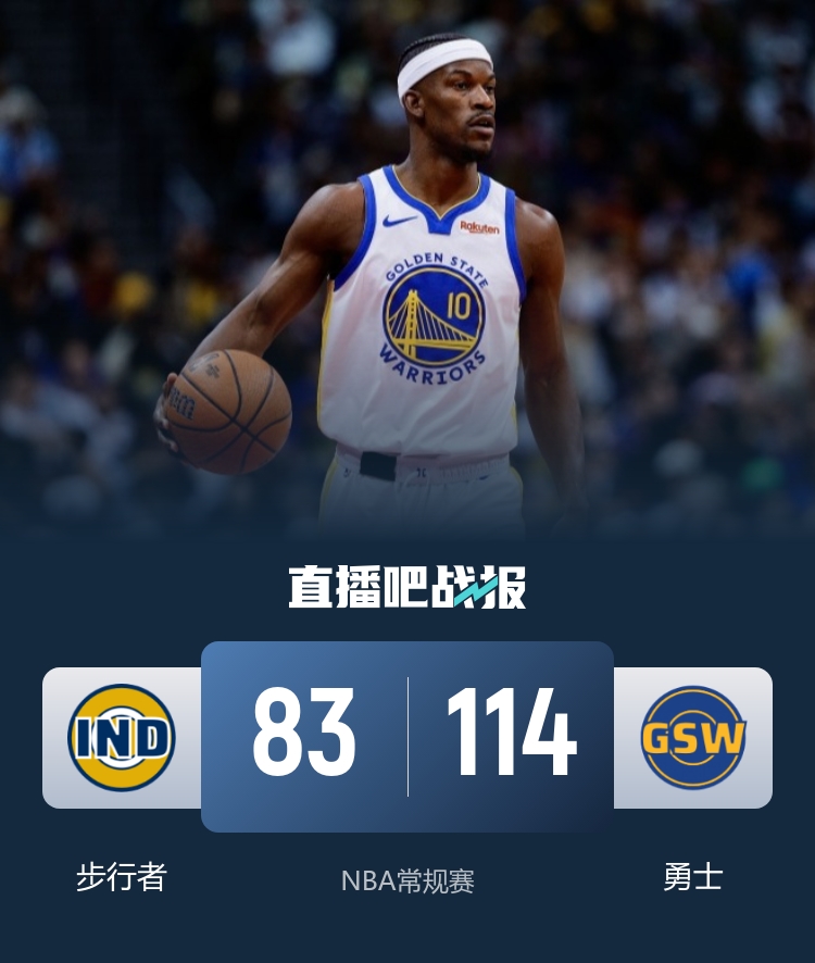 此役一上来勇士内外结合早早拉开比分,但中段勇士进攻断电,步行者一波10-0实现反超,末段两队陷入僵持,首节结束时勇士领先2分,次节回来,两队进攻效率依然不佳,勇士突然发力再次打出11-0小高潮,半场战罢,勇士保持7分优势。易边再战后步行者再度反超,穆迪连投带罚率队回敬10-0攻击波,三节结束后勇士依然领先10分,末节上来,巴特勒连投带传,理查德接连打进,勇士多点开花连续轰出进攻高潮终结悬念,最终勇士114-83大胜对手终结连败,同时送给步行者4连败。